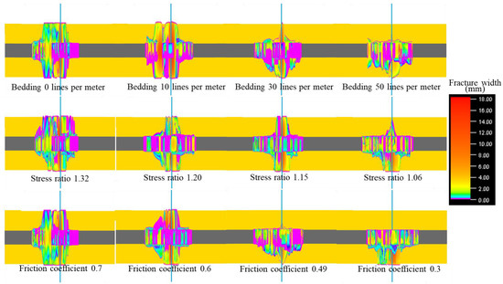 Figure 10 and Figure 11 illustrate the effects of different parameters on the vertical propagation morphology of hydraulic fractures when the roof and floor strata are sandstone and mudstone, respectively. As shown in Figure 10, both the stress ratio and friction coefficient significantly influence the through-layer penetration process of hydraulic fractures into the roof sandstone. As the stress ratio decreases, the extent of hydraulic fracture through-layer into the caprock sandstone is substantially reduced. When the ratio of the vertical principal stress (SV) to the minimum horizontal principal stress (Sh) is 1.11, the hydraulic fractures are completely confined within the coal seam. With a decrease in the friction coefficient, the penetration of hydraulic fractures into the caprock sandstone gradually weakens. When the friction coefficient is less than 0.54, only the primary fractures near the wellbore penetrate into the caprock sandstone, while the hydraulic fractures are predominantly confined within the reservoir (coal seam). The results in Figure 11 demonstrate that for the floor mudstone, when the bedding density is as low as 20 layers/meter, it can completely prevent hydraulic fractures from penetrating into the floor mudstone. Compared with Combination Scheme 1, the bedding in Combination Scheme 2 exhibits a significant influence on the penetration process of hydraulic fractures into the floor mudstone. Additionally, the penetration extension of hydraulic fractures near the wellbore into the floor mudstone is effectively constrained with a decrease in the stress ratio. However, similar to Combination 1, the friction coefficient of the floor mudstone has a minimal effect on the hydraulic fracture through-layer.