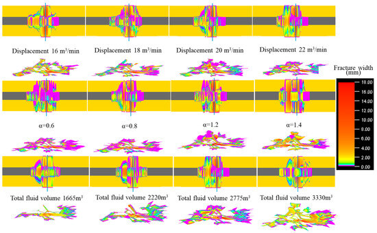 The results in Figure 2 have already shown that under the original pump schedule, the vertical penetration of hydraulic fractures in Combination 1 is quite severe, and the fracturing scale is limited. Therefore, we analyzed the effects of different fracturing parameters and fluid systems on the fracture extension morphology in Combination 1, as shown in Figure 5 and Figure 6. Here, α represents the ratio of the actual sand concentration in the pump schedule to the original sand concentration in Appendix A–Table A1. As shown in Figure 5, declining fracturing fluid injection rates trigger progressive energy dissipation within hydraulic fracture systems, which fundamentally governs the vertically constrained propagation characteristics of fractures adjacent to wellbores. Reducing the injection rate in the coal seam section effectively mitigates vertical fracture propagation. As the injection rate decreases, the fracture width of the secondary fractures initiated around the main fracture in the coal seam section significantly increases, which facilitates proppant entry into the secondary fractures. Additionally, as shown in Figure 5, with the decrease in proppant concentration, the fracture width after vertical propagation significantly reduces. Proppant cannot enter fractures with smaller widths, leading to the closure of fractures that have vertically propagated through the layers after fracturing. Therefore, reducing the proppant concentration can effectively mitigate the impact of vertical fracture propagation. As the total fracturing fluid volume decreases, vertical fracture propagation around the wellbore remains significant, while the fracture propagation phenomenon gradually weakens further from the wellbore. However, from the fracture morphology plan view, it can be observed that a substantial reduction in the total fracturing fluid volume significantly impacts the complexity of the fracture network, reducing the fracturing scale. Therefore, the optimization of fracturing fluid volume proves critical in governing vertical fracture propagation dynamics. As shown in Figure 6, with the decrease in the viscosity of the fracturing fluid system, vertical fracture propagation is significantly suppressed. The number of branch fractures surrounding the main fracture exhibits significant augmentation under the low-viscosity fracturing fluid system. For the Combination 1 reservoir, selecting a low-viscosity fracturing fluid system can effectively limit the vertical propagation of fractures through the caprock and floor shale, thereby increasing the scale of hydraulic fractures in the coal seam section.