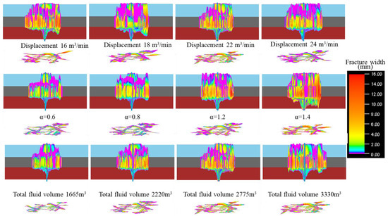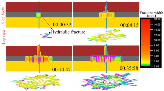Figure 9 illustrates the variation of the vertical fracture extension morphology over time steps for Combination 2 under the original pumping schedule used in the field (Appendix A–Table A1). As shown in Figure 9, similar to Combination 1, After the crack initiation from the fracturing cluster, the fracture does not propagate vertically through the cap rock sandstone and the bottom rock mudstone. With the injection of fracturing fluid, at a time step of 2 min and 53 s, the primary fracture near the wellbore begins to propagate into the caprock sandstone. However, unlike Combination 1, the primary fracture does not extend into the floor mudstone at this stage. At a time step of 7 min and 44 s, some fractures near the wellbore have crossed into the middle region of the floor mudstone and the top of the caprock sandstone. At the current developmental phase, a multitude of subsidiary fracture branches have propagated, culminating in the emergence of an intricate fracture architecture At the end of the pumping schedule, a large number of fractures in the direction of primary fracture propagation have crossed into the caprock sandstone, and the fracture width in the upper section is generally smaller than that in the coal seam. However, only the hydraulic fractures near the wellbore have extended into the floor mudstone. Overall, under the field pumping schedule, compared to Combination 1, Combination 2 exhibits more significant penetration into the caprock sandstone, while the penetration into the floor mudstone is less pronounced.