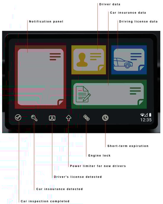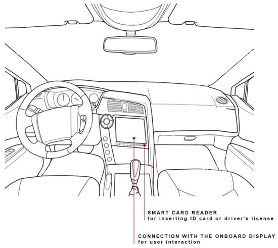 Currently, there are no countries producing vehicles equipped with card reader systems capable of blocking the car in case of failure in verifying the driver’s license or age (see the sketch of Figure 1). The lack of a widespread adoption of smart card-based ignition systems can be attributed to several factors, including additional manufacturing and installation costs, challenges with integration with existing vehicle architectures, and the need for compliance with stringent regulatory frameworks such as UNECE Regulation No. 116 and FMVSS 114 [41,42]. Moreover, consumer adoption has been slow due to concerns regarding usability, potential failures in emergency situations, and the availability of alternative authentication technologies such as keyless entry and biometric verification. However, similar technologies, such as electronic immobilizers, are already in use to prevent vehicle ignition without the correct key. Additionally, some companies are developing advanced authentication systems, including biometric identification and facial recognition, to enhance vehicle security.