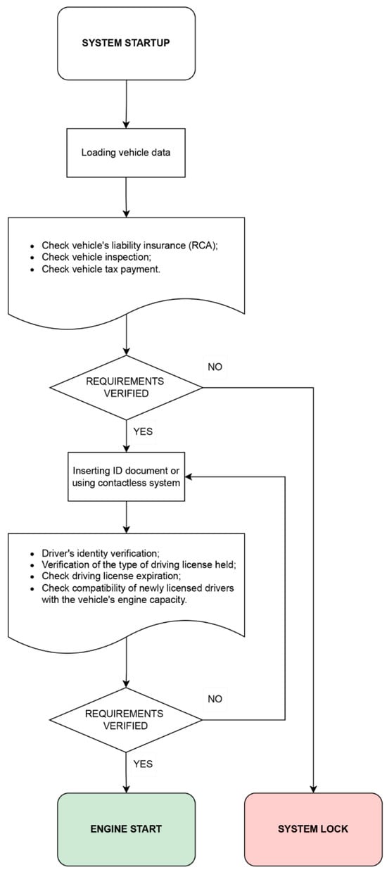 An innovative solution could involve the use of advanced card readers paired with smart cards, which would be able to block the car in case of rules violations; this is currently already in use for other applications [32,33,34]. These are not merely traditional cards, but sophisticated smart cards capable of real-time verification of the driver’s identity, license validity, payment status, and—most importantly—the driver’s eligibility to operate the specific vehicle type [29,30,31,32]. This system would work by requiring the driver to insert their smart card into the vehicle’s reader before starting the engine. If all checks are successfully verified, the vehicle will be enabled to start. If any requirement fails, the vehicle remains immobilized or may even shut down if already in use. This technology could serve as an effective preventive measure, ensuring compliance with regulations and significantly reducing the risks associated with non-compliance.