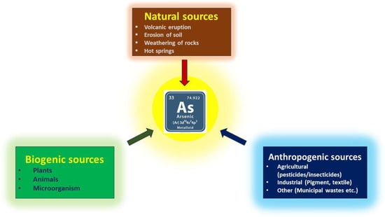 Arsenic exists in four oxidation states in nature: As(V), As(III), As(0), and As(−III). Recent research shows that the consumption of arsenic, particularly arsenic (III) and arsenic (V) ions, through food and drink has significantly increased [1]. Arsenic has already been classified by the World Health Organization (WHO) as a class I human carcinogen [2]. In response to emerging evidence on the chronic health effects of arsenic, the WHO revised its guidelines in 1993, reducing the recommended arsenic concentration in drinking water from 50 μg/L to 10 μg/L [3]. The U.S. Environmental Protection Agency (EPA) also set the same maximum contaminant level (MCL) of total arsenic in drinking water as recommended by WHO [4]. The primary sources of arsenic in surface and groundwater are multifaceted, encompassing both natural processes and human activities. Natural contributions include soil erosion and magmatic activity, which introduce arsenic into water bodies [5]. However, anthropogenic factors such as agricultural practices, industrial discharges, and mining operations significantly amplify arsenic contamination. For instance, the operation of mines can release harmful pollutants, including arsenic, threatening local health and the environment [6]. Unfortunately, arsenic is also widely used as a dietary supplement for animals, primarily to prevent diseases, promote growth, and improve the pigmentation of poultry meat, among other purposes [7]. The extensive use of agricultural chemicals has resulted in the prevalence of organic arsenic, including methylated organic arsenic (MOAs) and aromatic organic arsenic (AOCs), in the water ecological environment. Within 30 days, biotic and abiotic processes may convert the water-soluble AOCs in manure into extremely deadly inorganic arsenic species (such as arsenate), which contaminate soil and groundwater [8]. Among all four possible oxidation states for arsenic, plants and animals are mostly harmed by the trivalent and pentavalent forms of arsenic [9]. It has also been found that trivalent arsenic species exhibit greater toxicity compared to pentavalent arsenic species [10]. Therefore, the detection of arsenic content is critical for biological, environmental, medicinal, agricultural, and other relevant sectors, considering the health concerns. Figure 1 summarizes the different sources of arsenic in the environment.