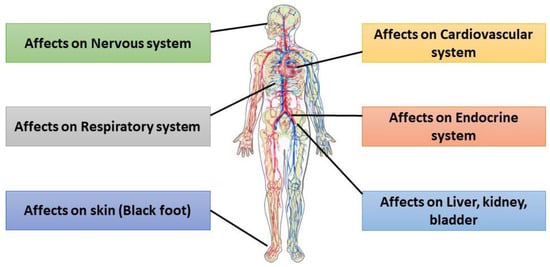 Arsenic is one of the most prevalent metalloids in nature and is known to be carcinogenic to living organisms. Chronic exposure to arsenic-contaminated drinking water can result in both immediate and long-term adverse health effects. (Figure 2). Acute arsenic intoxication has been reported to cause acute gastrointestinal syndrome (AGS) and acute paralytic syndrome (APS) [17]. In APS, cardiovascular failure occurs, and central nervous system depression is observed, partly due to the necrosis of both red blood cells (RBCs) and white blood cells (WBCs) [18]. Arsenic (III) affects blood vessels, leading to impaired circulation and symptoms such as tingling or numbness in the hands and feet. The early manifestations of AGS include dysphagia, dry mouth, burning lips, and a characteristic garlic-like taste [19]. Chronic arsenic exposure is associated with Blackfoot disease, a well-documented vascular disorder [20]. Additionally, arsenic undergoes biomethylation in the body, converting it into more toxic and carcinogenic forms [21]. Arsenic undergoes enzymatic methylation in the body, primarily facilitated by arsenic (III) methyltransferase (AS3MT). This process converts inorganic arsenic into methylated metabolites, including monomethylarsonic acid (MMA) and dimethylarsinic acid (DMA). However, arsenic exposure can disrupt DNA methylation patterns, leading to the hypermethylation of tumor suppressor genes such as p16 and p53, thereby increasing the risk of carcinogenesis. Additionally, arsenic interferes with DNA repair enzymes, further contributing to genomic instability and the potential development of cancer [22]. Chronic arsenic toxicity is commonly associated with specific skin patches in pigmentation and keratosis [23]. Several studies have established a link between elevated arsenic levels in drinking water and an increased risk of cancer in the skin, bladder, lungs, and other organs [20]. Global public health is greatly affected by arsenic-induced sickness, including cancer, black foot, etc. [17]. Therefore, accurately determining arsenic concentrations in drinking and environmental water is crucial for identifying arsenic contamination. Prompt detection of arsenic in water can aid in mitigating arsenic-induced health disorders and prevent long-term exposure risks.