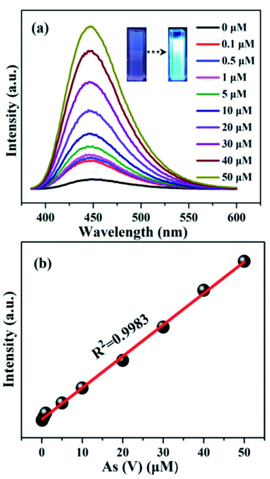 (a) Fluorescence spectra of the NH2-MIL-88(Fe) aqueous suspension (50 mg L−1) upon the addition of different concentrations of As(V) [0.1 to 50 µM] under excitation at 350 nm; (b) linear fitting plot between the fluorescence intensity of NH2-MIL-88(Fe) and the concentration of As(V). Reproduced with permission from ref. [73] Copyright 2017, RSC.