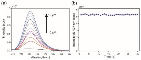 Tian et al. prepared an Ln-MOFs-based probe by employing europium as a metal center and condensation product of 4-formylbenzoic acid and 4-amino-3-hydroxybenzoic acid as ligands for the fluorogenic recognition of arsenate ion (AsO43−) [75]. Without arsenate, the aqueous suspension of the sample showed a weak fluorescence near about 427 nm. On the other hand, when trace amounts of arsenate were added, the sample’s emission intensity increased certainly, and the emission band progressively enhanced with increasing concentration of arsenate (Figure 5). The specificity of the arsenate ion of the probe was also examined by adding several possible interfering ions. Upon the addition of the congeners, minimal effect was observed in the luminescence property of the probe. The LOD value for the probe towards the detection of the probe is 17.8 nM. The periodic density functional theory (DFT) calculation predicts that twisted features of the linker of Ln-MOFs, as well as energy transfer from the linker to Eu ion, were mainly responsible for the weak fluorescence property of the Eu-MOFs in the absence of the arsenate ion. In the presence of arsenate ions, the twisting of the ligand unit is likely reduced due to hydrogen bonding interactions between the arsenate anion, the phenolic hydroxyl group, and the imine nitrogen. This interaction is predicted to enhance the rigidity of the unit and restrict the C–N isomerization of the linker [76,77]. Thus, it was found that Ln-MOF’s fluorescence was enhanced in the presence of arsenate as opposed to its fluorescence in its absence.