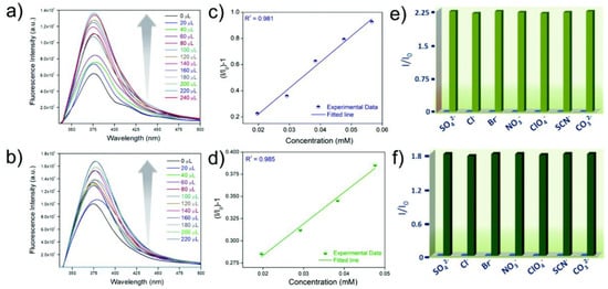 Fluorescence turn-on response of iMOF-4C with the inclusion of (a) HAsO42− (0 to 240 µL) and (b) HAsO32− (0 to 220 µL); a linear fit of (I0/I −1) vs. concentration of the analyte for iMOF-4C in a low concentration region for (c) HAsO42− and (d) HAsO32−; comparison of the fluorescence response of iMOF-4C in the presence of other competing anions toward (e) HAsO42− and (f) HAsO32−. Reproduced with permission from ref. [78] Copyright 2021, RSC.