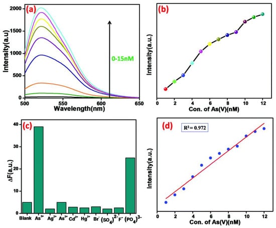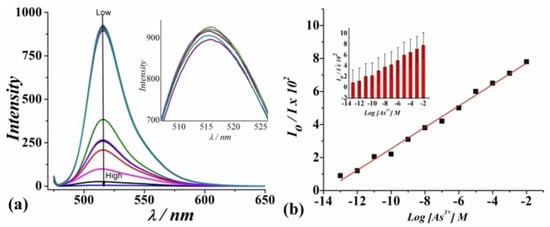 A novel turn-off fluorescent sensor for the selective detection of As3⁺ was developed by Shukla et al. This sensing method utilizes a fluorescein (Flu) molecule as the emitting center, polyhedral micellized silver colloids (AgNPs) to stimulate the excitation rate, and a nanoscaled Prussian blue metal-organic framework (PB-MOF) as the light sensitizer. [108]. The Fluorescein/AgNPs/PB-MOF system serves as a fluorescent sensor for the selective detection of As3⁺. Upon the addition of As3⁺, a noticeable decrease in the emission intensity of the fluorescent system is observed (Figure 12a). Furthermore, a linear relationship between As3⁺ concentration and signal intensity, with a sensitivity of Kv = 2.305 vol–1, is evident (Figure 12b). The detection limit is estimated to be 0.150 ppm. The incorporation of AgNPs and PB-MOF facilitates intermolecular activation, leading to a sequential amplification of fluorescein’s emission maxima (λem = 520 nm). Interaction with As3⁺ induces non-radiative energy transfer, resulting in the quenching of the emission spectra [109,110]. Notably, the sensor exhibits high selectivity for As3⁺ over other potential interfering ions, including Na+, K +, Cs+, Ca2+, Mg2+, Cr 3+, Mn2+, Zn 2+, Cd 2+, and Pb2+.