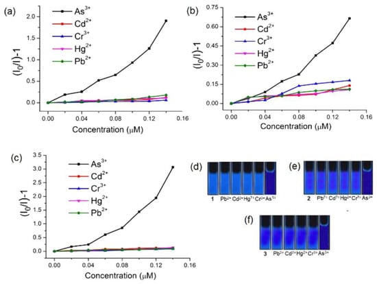 During the “turn-off” detection of a targeted analyte, the emission property of the probe is significantly diminished. In the year 2018, Siddiqi et al. synthesized three lanthanide MOFs (Ln–MOFs) [Ln3(PDC)3Cl3(H2O)]n [Ln = La (1), Nd (2) or Pr (3), PDCH2 = pyridine-2,6-dicarboxylic acid] [93]. These Ln-MOFs were successfully applied for the detection of As3+ in a water medium. Specificity towards As3+ was also examined for all three MOFs, and it has been observed that the said MOFs showed great selectivity towards As3+ over possible interfering metal ions (Fe3+, Cr3+, Cd2+, Hg2+, Pb2+, etc.) (Figure 8). The calculated detection limit of all three Ln–MOFs (1–3) is significantly lower than the permissible limit set by the WHO and U.S. EPA for As3⁺ ions in drinking water (10 ppb). The mechanism underlying the selectivity for As3⁺ ions was investigated using emission and absorption spectra. The As (lone pair)–π(aryl) interactions between As3⁺ ions and PDC²⁻ moieties may lead to the formation of a ground-state non-fluorescent complex, which the authors suggested as the responsible mechanism for the observed static quenching [94,95]. Thus, the Ln-MOFs could be utilized as a promising sensing platform for As3+.