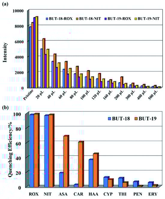 (a) Fluorescence changes of BUT-18 and -19 dispersed in water upon incremental addition of ROX and NIT (100 ppm) and (b) fluorescence quenching of BUT-18 and BUT-19 by different analytes (100 ppm) (λex = 280 nm). Reproduced with permission from ref. [96] Copyright 2019, RSC.