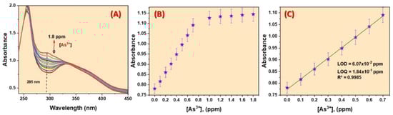 (A) Spectrophotometric spectra, (B) calibration plot, and (C) calibration curve of the 5Cl2HA = (Zr) MOF sensor with various As3+ ions concentrations in aqueous medium. Reproduced with permission from ref. [98] Copyright 2023, Elsevier.