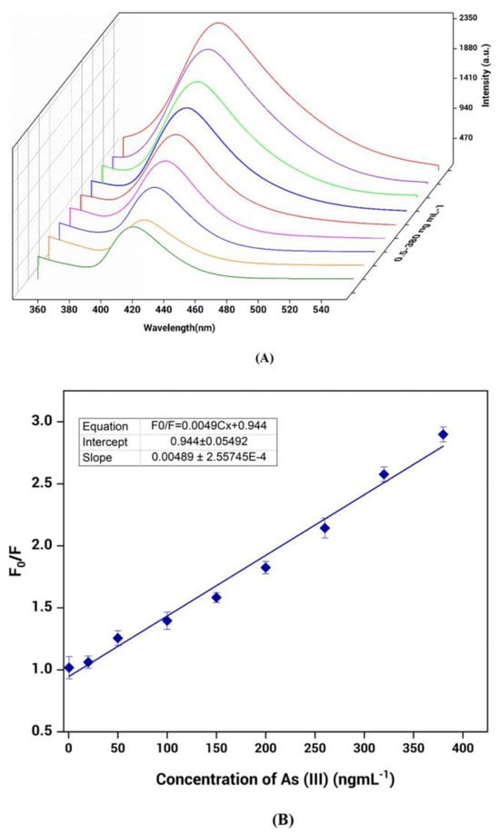 (A) Fluorescence emission spectra of aqueous suspension of AuNPs@Fe-BTC MOF (stabilized in citrate buffer) in the presence of a different concentration of As (III) under optimal conditions and (B) calibration curve for As(III) based on AuNPs@Fe-BTC sensing system. Reproduced with permission from ref. [101] Copyright 2023, Elsevier.