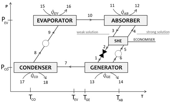 The heat added/removed in the heat exchangers of the SSAHT (evaporator, absorber, condenser, and generator) can be calculated using Equation (4). This equation accounts for the sensible heat transfer based on the external circuits (streams 11 to 18, Figure 1).