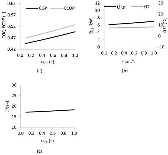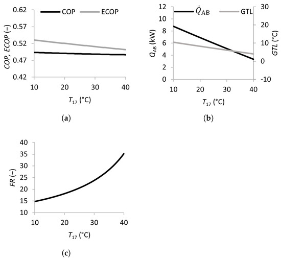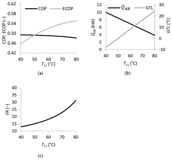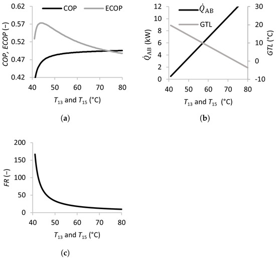 The effects of the temperatures of the external feed streams were analyzed in this study—namely, the temperature of the feed stream to be upgraded in the absorber , the temperature of the waste heat streams entering the generator and evaporator and , and that of the cooling stream in the condenser . The effects of varying these temperatures on the performance of the SSAHT are summarized in Figure 2, Figure 3 and Figure 4.