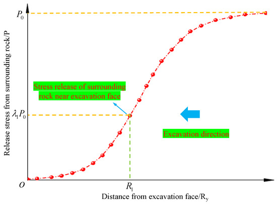 In the engineering example, it is assumed that the equivalent modulus of the surrounding rock is E(t) = E, and the three-dimensional space under spatiotemporal effects can be transformed into a two-dimensional space under spatial effects for analysis. Due to the spatial effect of the excavation face, the range of influence is from behind the excavation face 6R to the front of the excavation face 4R. When the influence range exceeds the end, the stress released by the surrounding rock reaches its maximum, which is the original rock stress. Therefore, according to Equation (1), the variation law of the released stress of the surrounding rock under the spatial effect of the excavation face is obtained, as shown in Figure 1.