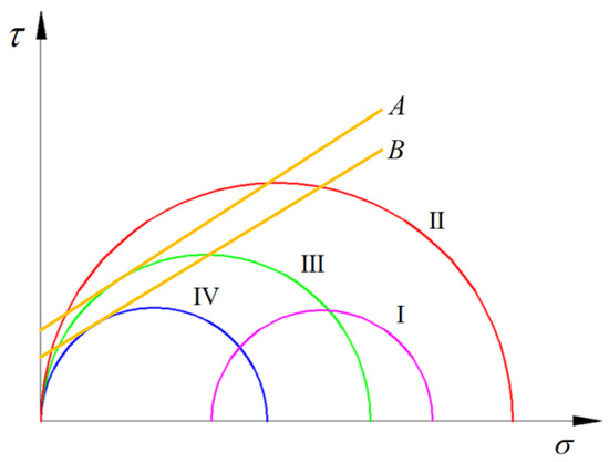 Affected by the spatial effect of excavation face, the deformation and stress release of surrounding rock need to go through a process. Near the excavation face, the deformation and stress release of surrounding rock are relatively small. As the distance from the excavation face increases, the deformation and stress release of surrounding rock gradually increase. Obviously, it is unreasonable to use the maximum stress P0 for a single support design. With the cyclic advancement of the excavation face, the deformation of the surrounding rock shows a non-linear and non-increasing trend until the deformation of the surrounding rock is in a stable period. In Figure 2, I represents the stress circle before excavation, II represents the stress circle immediately after excavation, III represents the stress circle shortly after excavation, IV represents the stress circle after excavation for a long time, A represents the envelope line after excavation, and B represents the long-term envelope.
