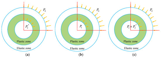 To quantitatively characterize the spatial constraint effect of the excavation face mentioned above, the concept of “virtual support force” is introduced [21]. At this time, the surrounding rock of the roadway is deformed under the combined actions of the original rock stress p0, virtual support force p2*, and support reaction force p1, as shown in Figure 3. On this basis, considering the theoretical formula for radial displacement of roadways, a functional relationship between the surrounding rock displacement, virtual support force, and support reaction force can be established.