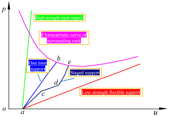 In Figure 4, line ab represents the one-time support method, and path acde represents the combined support method in stages. Among them, line ac is the first stage support, line cd is the second stage support, and line de is the third stage support. As the deformation of the surrounding rock develops and the stiffness of the support increases, the interaction between the surrounding rock and the support exhibits dynamic changes, as shown in Figure 5.