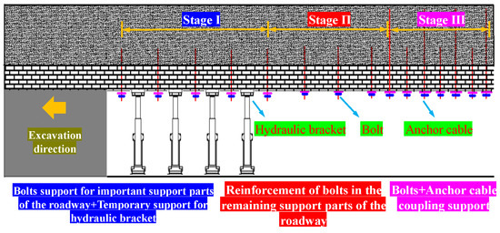Due to the unloading effect of roadway excavation, the stress release in the shallow range of the surrounding rock is relatively high, and the deformation of the surrounding rock increases accordingly. The development range of the plastic zone increases and gradually expands to the deep. Its strength and elastic modulus significantly decrease, and the stress state of the roof changes. Under the action of redistributed stress, the roof will undergo plastic deformation or loosening failure. Through the analysis of the stress generation mechanism during the formation process of the roadway, it is found that due to the more complex stress state of the surrounding rock in the actual site, especially when encountering geological conditions such as soft and broken surrounding rock and composite roof, if not supported in a timely manner, problems such as roof collapse are highly likely to occur. Moreover, the roof must strictly follow the “one excavation, one support” excavation process, and it is difficult to achieve completely parallel excavation and support operations, which seriously restricts the excavation speed of the coal roadway. To solve the problem of excessive support time during roadway excavation, based on the spatiotemporal effect of the excavation face and the bearing capacity of the surrounding rock itself, a dynamic staged control principle for the surrounding rock is proposed, which includes high-strength passive temporary roof protection near the excavation face and active support with rear bolts and anchor cables, as shown in Figure 3.