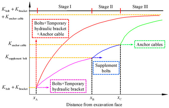 When using support structures such as bolts, anchor cables, and temporary hydraulic brackets to bear the deformation pressure of surrounding rock in the different support stages mentioned above, the joint support structure can be regarded as a support system composed of various support units, that is, the total stiffness of the support system is approximately equal to the sum of the stiffnesses of individual support units. According to Equation (7), the relationship curve between the total stiffness of the support structure and the distance from the excavation face can be obtained as shown in Figure 6. Among the variables, xA, xB, and xC are the construction positions for applying corresponding support structures in the stage I, stage II, and stage III, respectively. When the roadway roof condition is relatively broken, hydraulic support can be used for temporary support in the period after the completion of a cycle of excavation footage, and roof bolts and upper bolts of the coal slope can be fully drilled. At this time, xA and xB are approximately equal. As the driving face continues to advance in cycles, it will eventually approach the maximum stiffness that can be provided by the combined support system.
