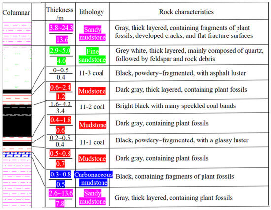 The 1211 (1) working face of Guqiao Mine is mining coal seam 11-2, with a burial depth of about 610 m, a thickness of 3.4 m, and a dip angle of 6°, making it a nearly horizontal mining coal seam. The 11-2 coal seam has stable occurrence, mainly bright black, bright coal and dull coal, with many vitrified coal bands, brittle and glassy luster, belonging to the semi-bright coal type, locally intercalated with one to two layers of carbonaceous mudstone, with a thickness of 0.1–0.4 m. The coal seam structure is complex, and the dip angle of the coal seam varies greatly due to the influence of faults and other structures. The basic roof is composed of fine sandstone with a thickness of 2.9–5.0 m, which is thick-layered, mainly composed of quartz, followed by feldspar and rock debris, interbedded with thin layers of siltstone, showing deformation bedding. The immediate roof is composed of mudstone and an 11-3 coal seam, with a thickness of 0.6–2.9 m. The mudstone is thick-layered, with plant root fossils found in the upper part and plant stem and leaf fossils in the lower part. The 11-3 coal seam is powdery to fragmented, mainly consisting of bright coal, followed by dull coal, both of which are semi-bright coal with asphalt to glass luster. The immediate floor is composed of mudstone and an 11-1 coal seam, with a thickness of 1.4–3.9 m, and the lower part contains a thin layer of carbonaceous mudstone with a thickness of 0.3–0.8 m. The basic floor is sandy mudstone, with a thickness of 2.6–13.6 m, thick-layered, and containing copious plant fossils. A comprehensive bar chart of the 11-2 coal seam roof and floor is shown in Figure 7.
