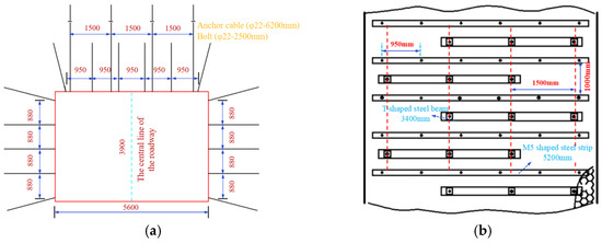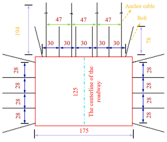 The design cross-section of the roadway is rectangular, with a cross-sectional size of 5.6 m × 3.9 m. The bolt mainly adopts a threaded steel pretension bolt, with a specification of Φ22 mm × 2500 mm. Six bolts are arranged on the roof with a spacing of 950 mm × 1000 mm, and five bolts are arranged on each rib with a spacing of 880 mm × 1000 mm. The anchor cable is arranged in an alternating manner of “3–3”, and its material is prestressed steel strand. The anchor cable specification is Φ22 mm × 6200 mm, and the spacing between anchor cables is 1500 mm × 1000 mm. The roadway support section is arranged as shown in Figure 8.