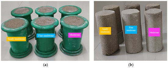 For this purpose, river sand, lime, and gypsum were selected as aggregates. In order to further simulate the lithological effect of actual rock layers, the above aggregates were mixed with water in different ratios and loaded into cylindrical molds with a size of φ 50 mm × 100 mm. The top of the mold was pressurized to the required size for the test, and the corresponding cylindrical specimens were made. The production and process of the specimens are shown in Figure 9.