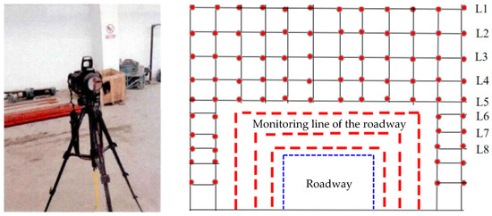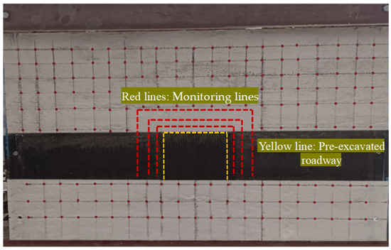 In order to obtain the stress changes and deformation laws of the roadway roof, pressure boxes are arranged above the roadway roof for stress monitoring. Three rows of stress monitoring sections are arranged in the direction of the roadway, with two points arranged in each row, for a total of six stress monitoring points. They are located 0–3 cm (initial support area), 42–69 cm (secondary reinforcement support area of the roof and rib), and 69–90 cm (permanent support area) away from the excavation head. Three displacement measurement lines are arranged around the roadway, with the remaining lines increasing every 5 cm in the vertical direction. One Nikon-550D camera is used in conjunction with a WEA-Qc8 intelligent high-definition camera to adjust the monitoring angle and monitor the displacement of the model surface and the roof inside the roadway. After the monitoring is completed, the captured observation points are imported into Getedate V2.25 software for processing. The layout of displacement measurement lines for the surrounding rock of the roadway is shown in Figure 11.