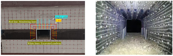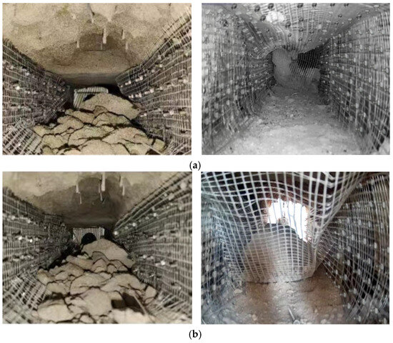 Based on the above calculation, the compensation load applied above the roadway model is 0.33 MPa, and the cross-sectional area at the top of the model is 1.1 m2. A step-by-step loading method is adopted to achieve the failure law of the model roadway roof under different stress loading conditions and its impact on the supporting bearing body. When the original rock stress is applied above the model roadway, excavation of the frontal coal body (extraction of wooden strips) begins, and temporary support models are taken out to supplement the anchor mesh and cable support of the model roadway, as shown in Figure 14.