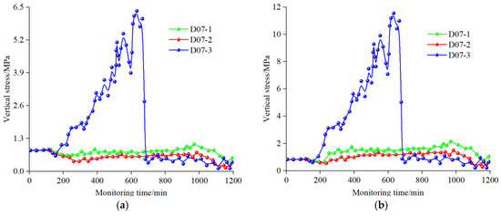 Vertical stress–time relationship curves of roadway roof. (a) 5 cm measuring point above the roadway. (b) 15 cm measuring point above the roadway.