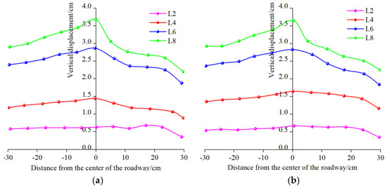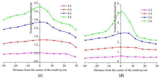 The absolute displacement of the roadway reflects the direct support effect, while the relative displacement reflects the degree of rock damage. We used a high-definition digital camera to capture data from various displacement observation points in the images, imported the measured images into Getedate V2.25 software, analyzed their coordinate points, and obtained the horizontal and vertical coordinates of the measuring points in the roadway at different loading depths during the loading process, in order to analyze the displacement of individual measuring points around the roadway. The displacement distribution curves of the four displacement measurement lines mentioned above are shown in Figure 16. The horizontal axis in the figure represents the relative position to the center of the roadway, and the four monitoring lines are L1, L4, L6, and L8, located 22 cm, 12 cm, 6 cm, and 2 cm above the roof, respectively. Analysis shows that during the initial loading stage, the load acting on the roof is relatively small, and the vertical displacement of the roof remains roughly synchronized and sinks, manifested as the overall sinking of the compacted model. As the vertical stress increases, the displacement curve of the roof basically shows a basin-shaped settlement trend, and the curves all evolve into a “V” shape. The farther away from the center of the roadway, the smaller the subsidence of the roof, and the maximum subsidence point occurs at the center of the roadway.