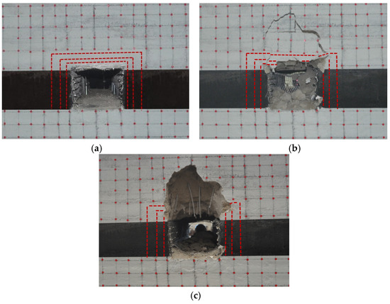 The entire process of roof failure under graded loading: (a) at load 36.3kN; (b) at load 47.19kN; (c) at load 54.45kN.