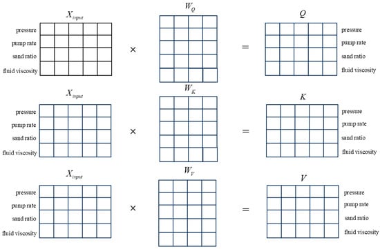 The self-attention mechanism first calculates the input sequence Query (Q), Key (K), and Value (V), and the calculation formulas are shown in Equations (2)–(4). The calculation process of Q, K, and V in the pressure prediction process is shown in Figure 3. During the calculation process, the model performs a weighted average on the input of each position, with weights determined by the input of other positions, to capture the relationships between different positions.