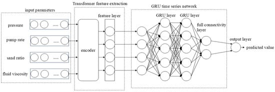GRU can capture parameter information and long-term dependencies on pressure in fracturing pressure data, while Transformer can effectively capture the relationship between any two positions in fracturing pressure data, thus dealing with long-distance dependency problems and greatly avoiding the influence of noise in the original data on pressure prediction. Therefore, this paper connected GRU and Transformer to establish a GRU-Transformer model, mainly by inputting normalized fracturing construction data. Transformer uses an encoder to perform a high-dimensional transformation on fracturing construction, captures its data features, and transmits the data to GRU for pressure prediction. The structure of the GRU-Transformer model is shown in Figure 4.