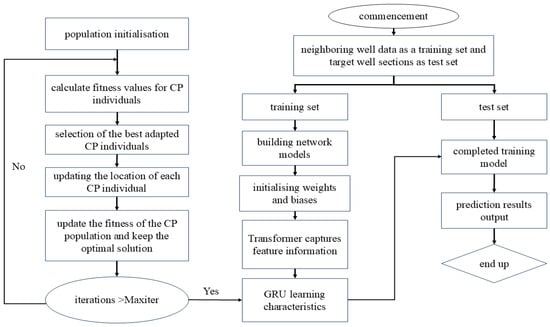 The pressure prediction process adopts a sliding window mode along the time axis to achieve data partitioning, and the data shape is a window at the end of the time when the dataset is reached. The input variables are construction parameters such as pressure, time, displacement, liquid viscosity, and sand ratio. A combined neural network model is established through CPO, GRU, and Transformer to simulate the nonlinear relationship between pressure and construction parameter data, and finally, output the predicted pressure data. The implementation process of the composite neural network is shown in Figure 5 and the model prediction process is described. The specific process from input to output is as follows: (1) Divide the training set and the testing set; (2) Establish the GRU-Transformer model; (3) Model training and CPO optimization of model parameters; (4) Input the test set for prediction; (5) Output of pressure prediction results.