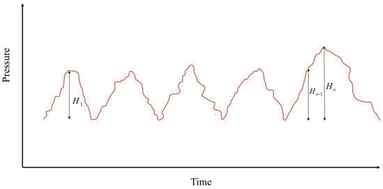 To save computational efficiency and provide a more intuitive sand screenout warning, the physical model proposed in this paper is improved based on the slope reversal method. Based on the research of some scholars on sand screenout [31,32,33] and the analysis of oilfield data, it is found that an important characteristic of fracturing pressure when sand screenout is about to occur is the formation of an abnormal peak, which is also the basis of the slope reversal method. However, it does not consider the relationship between the maximum and minimum values of the peak, that is, the threshold, as shown in Figure 7. The maximum and minimum difference for one cycle under normal construction conditions will not exceed this range for subsequent construction cycles. However, the last peak has reached the difference range at , but its difference continues to soar to , indicating that sand screenout may occur in this area and sand-stopping operations are needed to avoid sand screenout. Based on this, this article has added evaluation criteria to avoid erroneous alarm situations caused by slope reversal method warning and improve the accuracy of the sand screenout warning model.