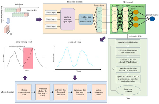 The implementation steps of a sand screenout warning model based on a combination of combinatorial neural networks and physical models are as follows: (1) sliding window extraction of time-series data sequence; (2) The Transformer model captures the nonlinear relationships of sequences; (3) GRU model training and CPO optimization of the model parameters; (4) Output the pressure prediction data; (5) The predicted results are input into the sand screenout warning model for judgement; (6) Output the judgement result. The specific implementation steps are shown in Figure 10.