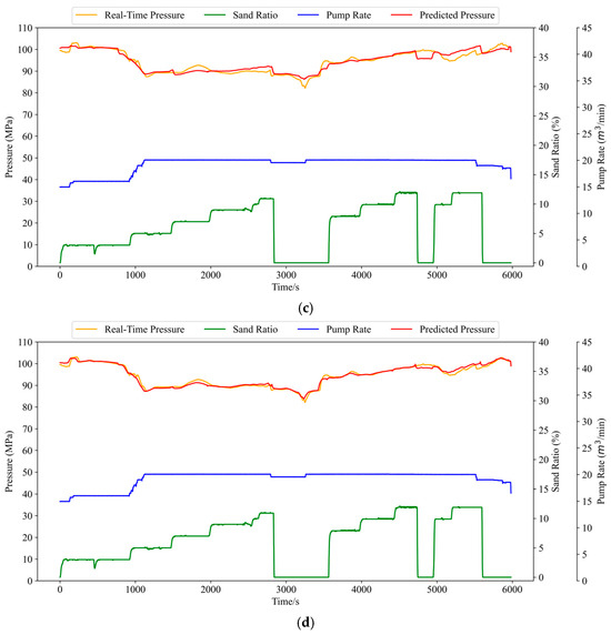 As observed in Figure 11c, although the data predicted by the CPO-GRU model fit the prediction model, there are some limitations in its enhancement effect in some small fluctuations. After introducing Transformer, the prediction results in Figure 11d show that Transformer can accurately find the relationship between the individual eigenvalues on the fracturing pressure at each time step, and its results can accurately predict the curve fluctuation condition. The proposed combined neural network model shows optimal prediction performance compared to the other three models, especially for the time point 3000 s–4000 s, in which the trough after sand stopping is accurately predicted by the model, and the pressure fluctuation can be accurately captured throughout the prediction process. These results are highly consistent with the actual curves, which proves the superiority of the model.