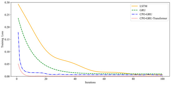 Figure 12 represents the curve of training loss with training number for LSTM, GRU, CPO-GRU and CPO-GRU-Transformer, all with 100 training times. The results show that under the same conditions, the combined neural network training loss proposed in this paper decreases the fastest, indicating that it has the quickest convergence speed, which effectively shortens the training time and improves learning efficiency. Figure 9 shows the evaluation metrics for fracture pressure prediction by the four models.