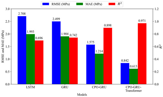 The prediction result curves for each model are shown in Figure 11. From Figure 11, it can be seen that the trend of the fracture pressure prediction results of the four models is basically consistent with the trend of the actual fracture pressure. From the point of view of prediction accuracy, the predicted fracture pressure curve of the CPO-GRU-Transformer model is the closest to the actual fracture pressure curve.