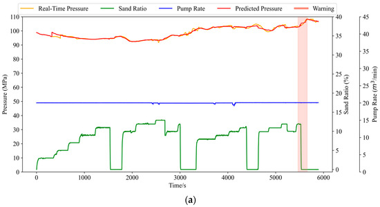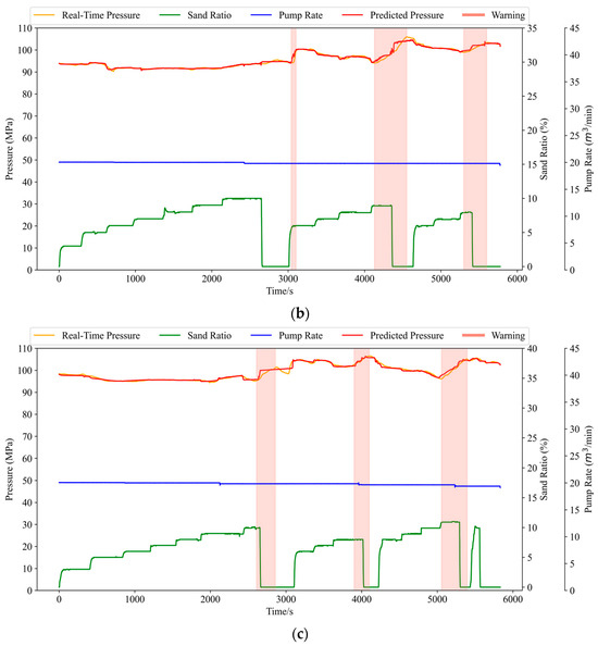 Furthermore, manual judgment often suffers from subjectivity and delay, especially under fluctuating pressure signals or complex downhole conditions. In contrast, the model’s ability to continuously monitor pressure trends and issue objective warnings improves both the response speed and operational consistency. These results highlight the model’s practical value as a reliable decision-support tool in hydraulic fracturing operations.