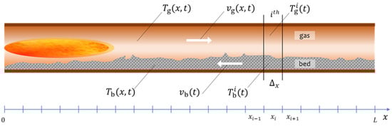 The classic approach to solving this problem is to divide the spatial domain into a grid of finite elements. In this study, since spatial variation is considered only in one dimension, the kiln is discretized into finite elements, representing sections of the kiln, each with a length of . Figure 5 provides a supporting diagram for the model, showing the main variables considered, which include the following: