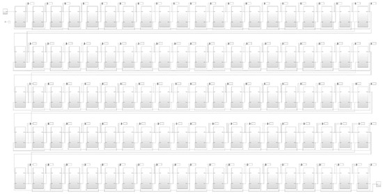 The model described above was implemented in Simulink, part of the MATLAB package (MathWorks, version 2016b). The number of elements was chosen based on the process time constant and the length of each section, and was rounded up to n = 100 elements, as shown in Figure 6. Figure 7 provides a more detailed view of the model’s structure, illustrating the internal blocks within each element.