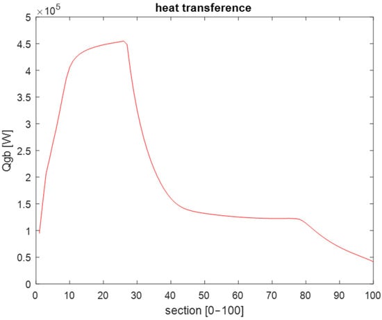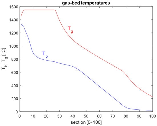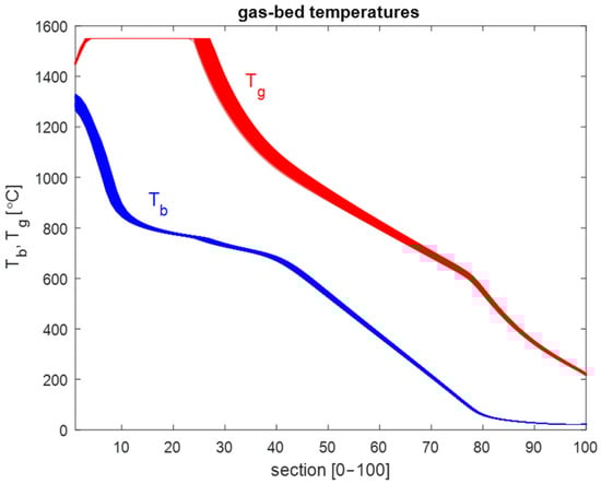 The initial simulations were conducted with constant inputs, i.e., stationary boundary conditions, over periods equivalent to ten hours of kiln operation. The objective was to establish a steady-state equilibrium profile to be used as the initial state for subsequent simulations. Figure 8, Figure 9, Figure 10 and Figure 11 show the steady-state profiles for temperatures, gas-bed heat transfer, bed mass flows, and gas velocity and density.