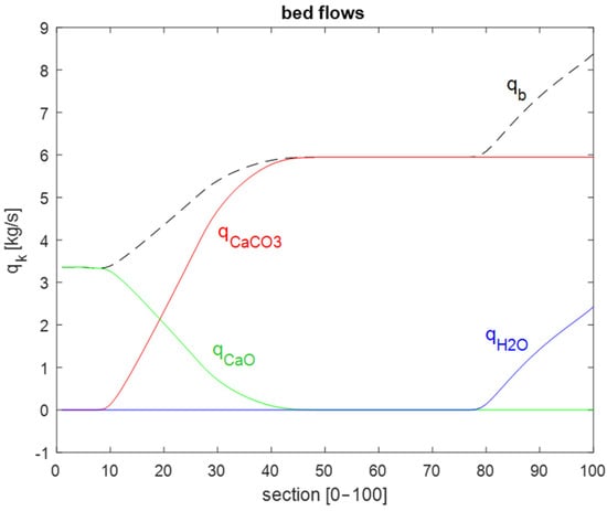- The linear velocity of the bed was assumed to be independent of the longitudinal position, meaning that while the velocity varies over time, it remains uniform throughout the entire furnace. It should be noted that since the mass changes during the drying and calcination processes, the mass flow rate depends on the process zone, even when the velocity is constant over time.