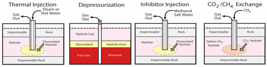 Natural gas hydrates (shortened as hydrates) are formed by the chemical reaction between natural gas (mainly methane) and water under low temperature and high pressure [1,2,3]. They are well recognized as a promising future energy to mitigate the crisis of conventional fossil ones because hydrates globally exist in ocean sediments and permafrost regions where the conditions for hydrate formation are easily satisfied. Currently, hydrate exploitation methods include the depressurization, thermal stimulation, chemical inhibitor injection, CO2 replacement and joint methods (such as joint use of thermal stimulation and depressurization) [4], as shown in Figure 1. Depressurization is the main method at present, which reduces pressure to promote the dissociation reaction of hydrates, and it is considered to be the simplest and most economical method. The thermal stimulation method is to increase the temperature of hydrates by heating, and when the temperature is greater than the phase equilibrium temperature of hydrates, the dissociation reaction occurs. The CO2 replacement method is to replace the methane in the hydrates by injecting CO2, which is based on the principle that CO2 is more likely to generate hydrates than CH4. The chemical inhibitor injection method is to change the phase equilibrium curve of hydrates by injecting inhibitors (e.g., methanol, brine, and ethanol), which is inefficient, costly and environmentally unfriendly. At present, the joint use of two or more methods is believed to be an efficient way to recover gas from hydrates.