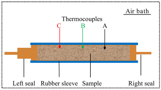 Since Masuda et al. [20] carried out an early investigation on hydrate dissociation in Berea sandstone, numerous scholars have chosen Berea sandstone as their case study [34,35,36,37]. Therefore, the laboratory test of Run 2 by Masuda et al. [20] is also used in this study, as illustrated in Figure 2. The experiment was conducted in an air-bath setting. A sample holder secured the Berea sandstone core, which was encased in a rubber sleeve and sealed at both ends. The Berea sandstone core used in the experiment measured 30.0 cm in length and had a cross-sectional area of 20.3 cm2. The core, devoid of natural gas hydrates, exhibited an intrinsic permeability of 0.0967 μm2 and a porosity of 0.182. By reducing the pressure at the core’s right boundary, the hydrate dissociation was triggered. Three thermocouples were uniformly distributed along the core at the right quarter point (Point A), the middle quarter point (Point B) and the left quarter point (Point C). Theoretically, more thermocouples could obtain more data. However, in practice, more thermocouples also influence the data precision because they take up more core space. Additionally, the beginning and end are the places easily influenced by outside uncertain factors. So, three thermocouples are installed in the middle of the core.
