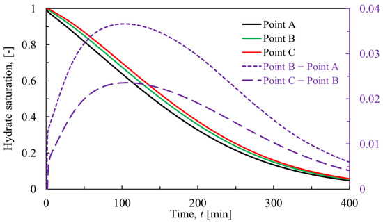 This part intends to reveal the change in hydrate saturation in the process of hydrate dissociation. Hydrate saturation is defined as the volume fraction of hydrates in the pores of porous media. As shown in Figure 3, the dissociation of hydrates starts at the right boundary (initial pressure-reduction boundary) and spreads leftward (from Point A to B, then to C), lasting about 400 min. Over this time, the gap of hydrate saturation at different points first increases before around 100 min and then decreases to zero gradually. This evolution pattern can be explained by the complicated competitions among influence factors, including temperature, reaction specific area and pressure [18,36]. At first, pressure drop controls the hydrate dissociation rate, so the hydrate dissociation is stronger at positions close to the depressurization boundary. Then, the temperature and reaction specific area dominates it, so when the hydrate saturation reaches half of the initial value, the hydrate dissociation at positions far from the depressurization boundary becomes stronger.
