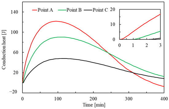 As shown in Figure 4, the cumulative conduction heat shows a trend of increasing and then decreasing during the hydrate dissociation, and the ending time of the conduction is basically the same as that of the hydrate dissociation. The increase of the cumulative conduction heat indicates that the heat is transferred from the left to the right of the core, and the decrease in the cumulative conduction heat means that the heat is transferred from right to left. Thus, the direction of heat conduction changes at around 100 min. This is consistent with the pattern of the gap of hydrate saturation in Figure 2. Additionally, we could observe that the curves of heat conduction at three quarter points intersect each other after 250 min, much later than the time of the direction change in heat conduction. The reason is the competition between the consumption heat by hydrate dissociation and the heat supply from the external environment [34,35,36,37]. Before 100 min, the consumption heat by hydrate dissociation is bigger. After 100 min, the contribution of heat supply from the external environment is bigger. Time between 100 min and 250 min is the process of external environment gradually compensating for the absorbed heat by previous hydrate dissociation.
