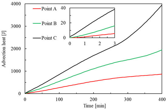 As shown in Figure 5, the cumulative advection heat shows a monotonically increasing trend in the process of hydrate dissociation, and the advection heat continues to increase rapidly at the end of the hydrate dissociation because the flow seepage still does not stop. The increase in the cumulative advection heat indicates that the heat is transferred from left to right, and the cumulative advection heat peak at the end of the hydrate dissociation is in the order of magnitude of 103 J, while the order of magnitude of the peak of the cumulative conduction heat is 102 J. Comparing the conduction heat and advection heat in the process of the hydrate dissociation, it can be found that they show significant differences in the overall trends and values. The reason behind this is that the conduction heat is mainly controlled by the temperature gradient, while the advection heat is mainly controlled by the flow of the fluid [36]. On one hand, the fluid flow can carry more heat than that caused by the temperature gradient, so the value of advection heat is much bigger than that of conduction heat. On the other hand, the direction of fluid flow is only from the depressurization boundary to another boundary, while the temperature gradient is firstly positive and negative, so the advection heat and conduction heat have different overall trends during hydrate dissociation.