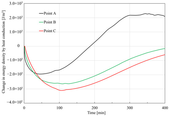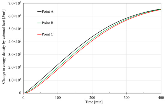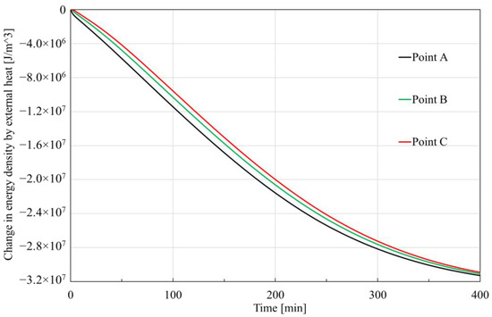 As shown in Figure 8, the external heat source generally has a positive effect on the energy density, and this effect is stronger at the place closer to the depressurized right boundary. The reason behind this is that the external environmental temperature is always bigger than that of the core, so the core would absorb energy from the external environment when its temperature drops due to the hydrate dissociation. The hydrate dissociation starts from the right boundary (depressurization boundary), thus the temperature at Point A decreases first, then Point B and lastly Point C. Thus, the external heat source provides more energy to Point A. Additionally, it is observed that the order of magnitude of the peak value is also 107 J in this case, a little greater than that caused by advection heat.